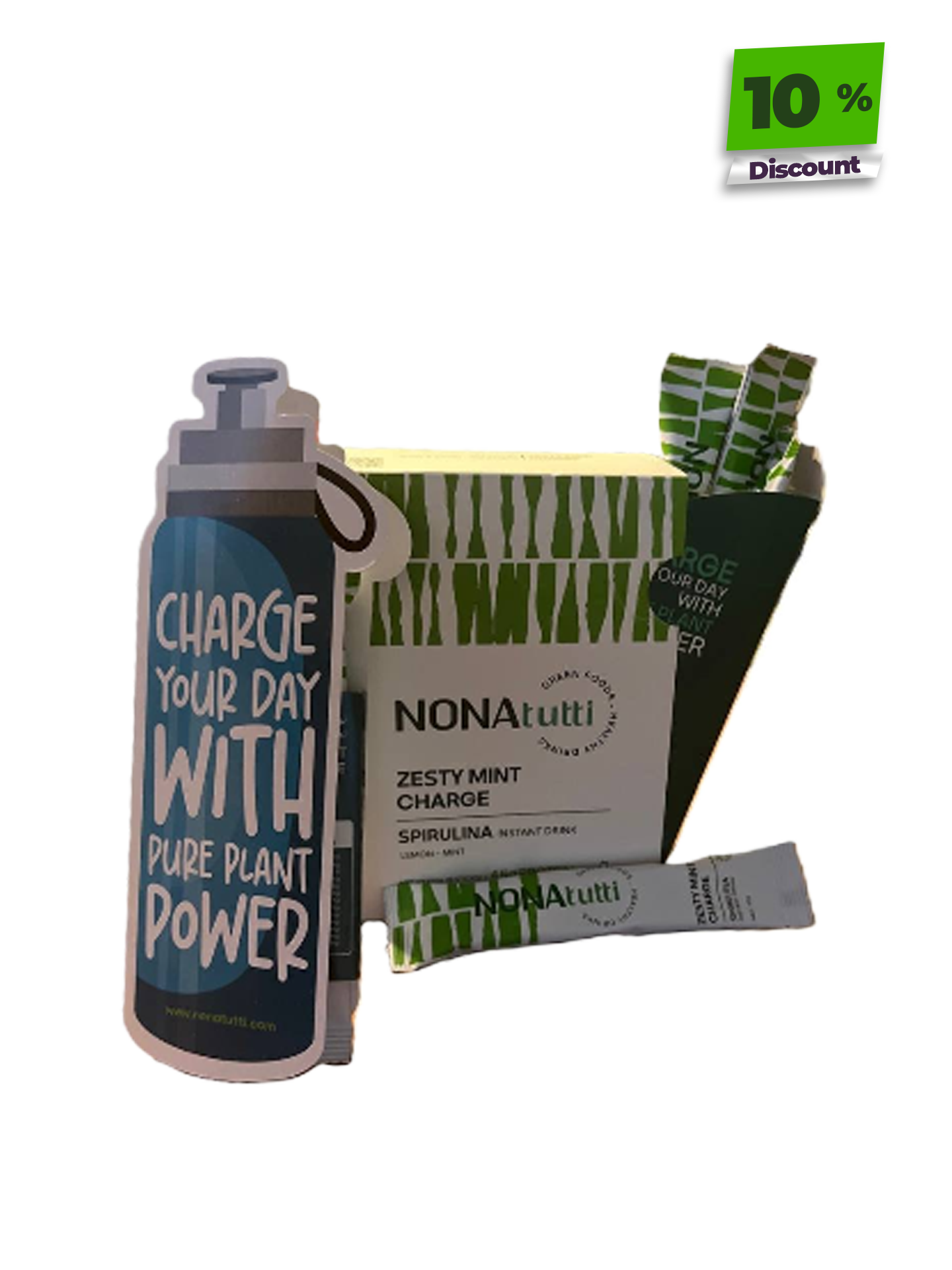 نوناتوتی با مجموعه جذاب پودرهای نوشیدنی اسپیرولینا برای یک سبک جدید زندگی از راه رسیده ! این طعم‌های خوشمزه کمک می کنه شما بیشتر بتونید از مواد مغذی اسپیرولینا بهره ببرید. هر ساشه محتوی ترکیب خارق العاده ای از اسپیرولینا و مواد طبیعی دیگه ست که تجربه‌ لذت‌بخش و سالمی رو به شما هدیه می‌کنه. با نوشیدنی Zesty Mint Charge هم از حس تازگی و پرانرژی نعناع و لیمو لذت ببرید و هم تمام مواد مغذی اسپیرولینا رو به بدنتون بررسونید. شما می تونید با روش های زیر این نوشیدنی رو میل کنید: 1- شات استارتر – یه روز خوب رو به سلامتی خودت با یه شات شروع کن نصف محتویات ساشه رو در یه لیوان شات با 35 میلی لیتر آب مخلوط و نوش جان کن ( شکل : شات 35 ml و ساشه ، شاید یه خورشید که نشوندهنده صبح هست) 2- ست بعد از تمرین ورزشی – بعد از ورزش به بازسازی و رشد عضلات بدنت کمک کن محتویات ساشه رو با 300 میلی لیتر آب در یک لیوان یا قمقمه ورزشی مخلوط و نوش جان کن. اگه دوست داشتی پودر الکترولیت هم اضافه کن (شکل قمقمه ورزشی 300 ml و آیکون های ورزشی ....) 3- اسموتی های جذاب – تا دلت می خواد با همین یک ساشه ، اسموتی ها و نوشیدنی های متنوع و مقوی درست کن محتویات ساشه رو به دلخواه با میوه ها ، آب میوه ها، انواع مغزها و آجیل ها و انواع سبزیجات مختلف ترکیب کن و طعم های جذاب و هیجانی جدید بساز. ( شکل میکسر اسموتی ساز با میوه ها و مغرها و سبزیجات و ..)