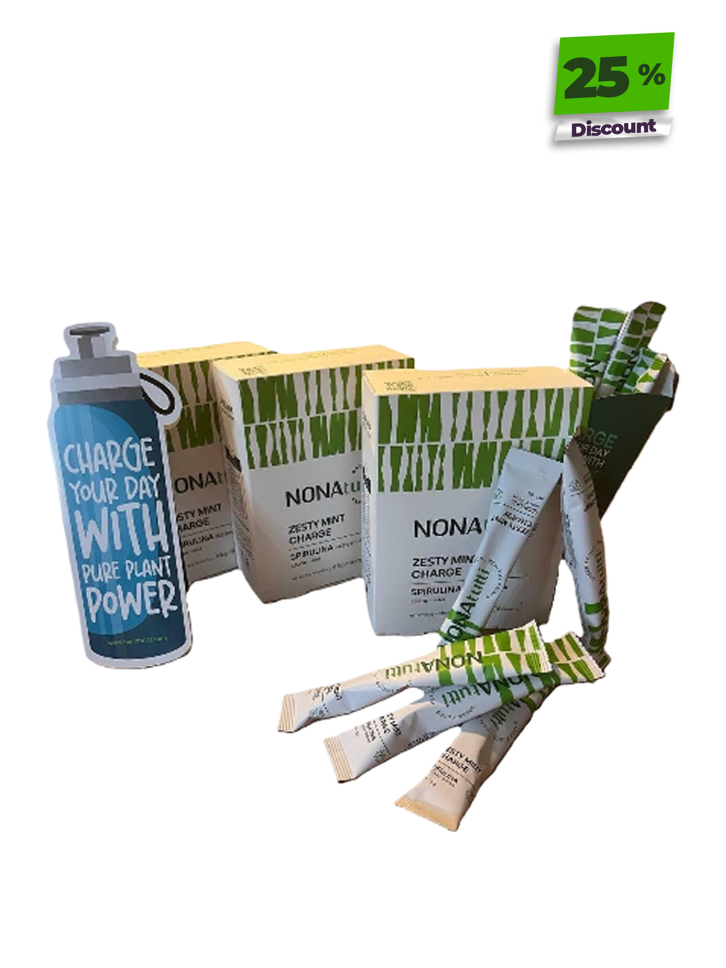 نوناتوتی با مجموعه جذاب پودرهای نوشیدنی اسپیرولینا برای یک سبک جدید زندگی از راه رسیده ! این طعم‌های خوشمزه کمک می کنه شما بیشتر بتونید از مواد مغذی اسپیرولینا بهره ببرید. هر ساشه محتوی ترکیب خارق العاده ای از اسپیرولینا و مواد طبیعی دیگه ست که تجربه‌ لذت‌بخش و سالمی رو به شما هدیه می‌کنه. با نوشیدنی Zesty Mint Charge هم از حس تازگی و پرانرژی نعناع و لیمو لذت ببرید و هم تمام مواد مغذی اسپیرولینا رو به بدنتون بررسونید. شما می تونید با روش های زیر این نوشیدنی رو میل کنید: 1- شات استارتر – یه روز خوب رو به سلامتی خودت با یه شات شروع کن نصف محتویات ساشه رو در یه لیوان شات با 35 میلی لیتر آب مخلوط و نوش جان کن ( شکل : شات 35 ml و ساشه ، شاید یه خورشید که نشوندهنده صبح هست) 2- ست بعد از تمرین ورزشی – بعد از ورزش به بازسازی و رشد عضلات بدنت کمک کن محتویات ساشه رو با 300 میلی لیتر آب در یک لیوان یا قمقمه ورزشی مخلوط و نوش جان کن. اگه دوست داشتی پودر الکترولیت هم اضافه کن (شکل قمقمه ورزشی 300 ml و آیکون های ورزشی ....) 3- اسموتی های جذاب – تا دلت می خواد با همین یک ساشه ، اسموتی ها و نوشیدنی های متنوع و مقوی درست کن محتویات ساشه رو به دلخواه با میوه ها ، آب میوه ها، انواع مغزها و آجیل ها و انواع سبزیجات مختلف ترکیب کن و طعم های جذاب و هیجانی جدید بساز. ( شکل میکسر اسموتی ساز با میوه ها و مغرها و سبزیجات و ..)